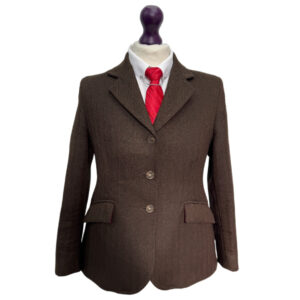 Le Beau Cheval maids dark brown herringbone tweed show jacket, with self collar, horse head buttons. Maids approx size 31″ was originally made bespoke so no size label. burgundy lining. Excellent condition! Measurements are- •Bottom of velvet collar to … Read More -