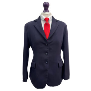 Lead Rein style double breasted jacket made in navy blue polyester material with red velvet trim, solid brass buttons. This jacket is in very good show condition, has 3 brass buttons at the cuff, there is no brand label inside … Read MoreSelect options This product has multiple variants. The options may be chosen on the product page -