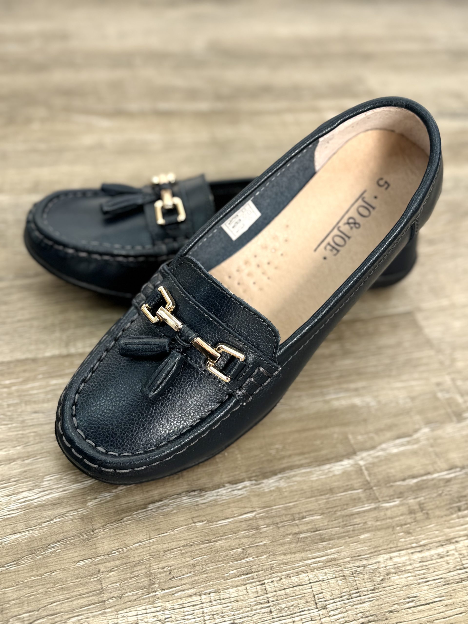 Ladies leather loafers with a gold colour bar, and tassel trim in navy blue.