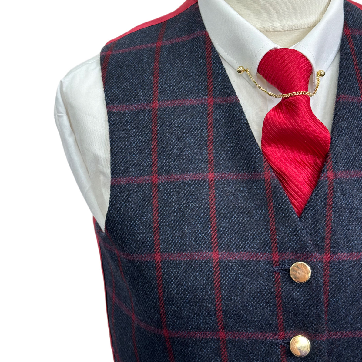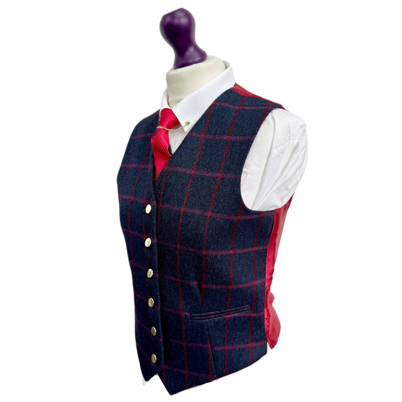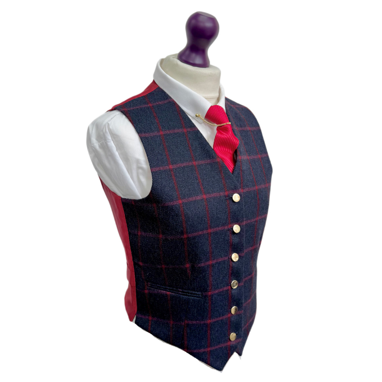 This particular tweed waistcoat has been created using a beautiful navy based tweed with red and raspberry overcheck.
