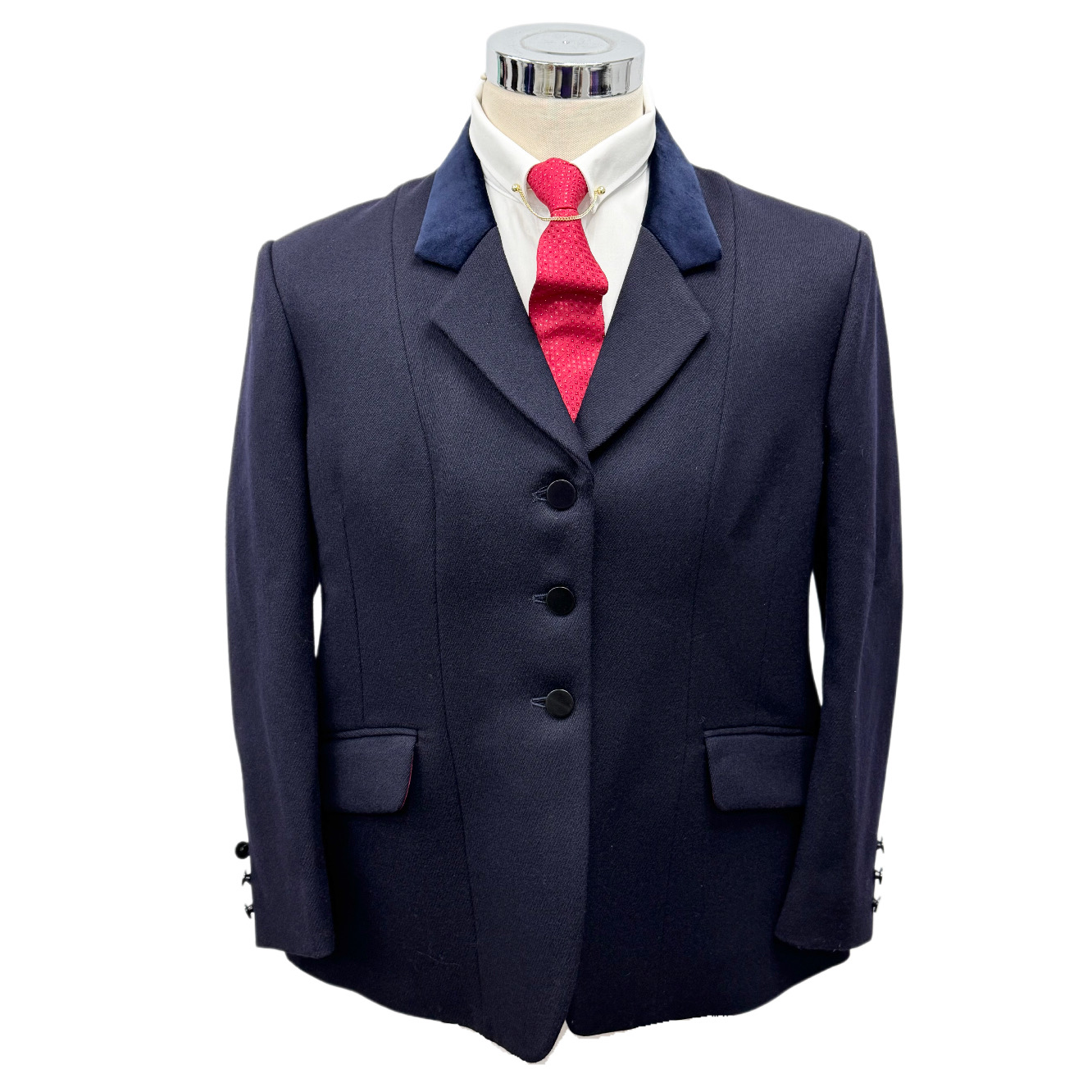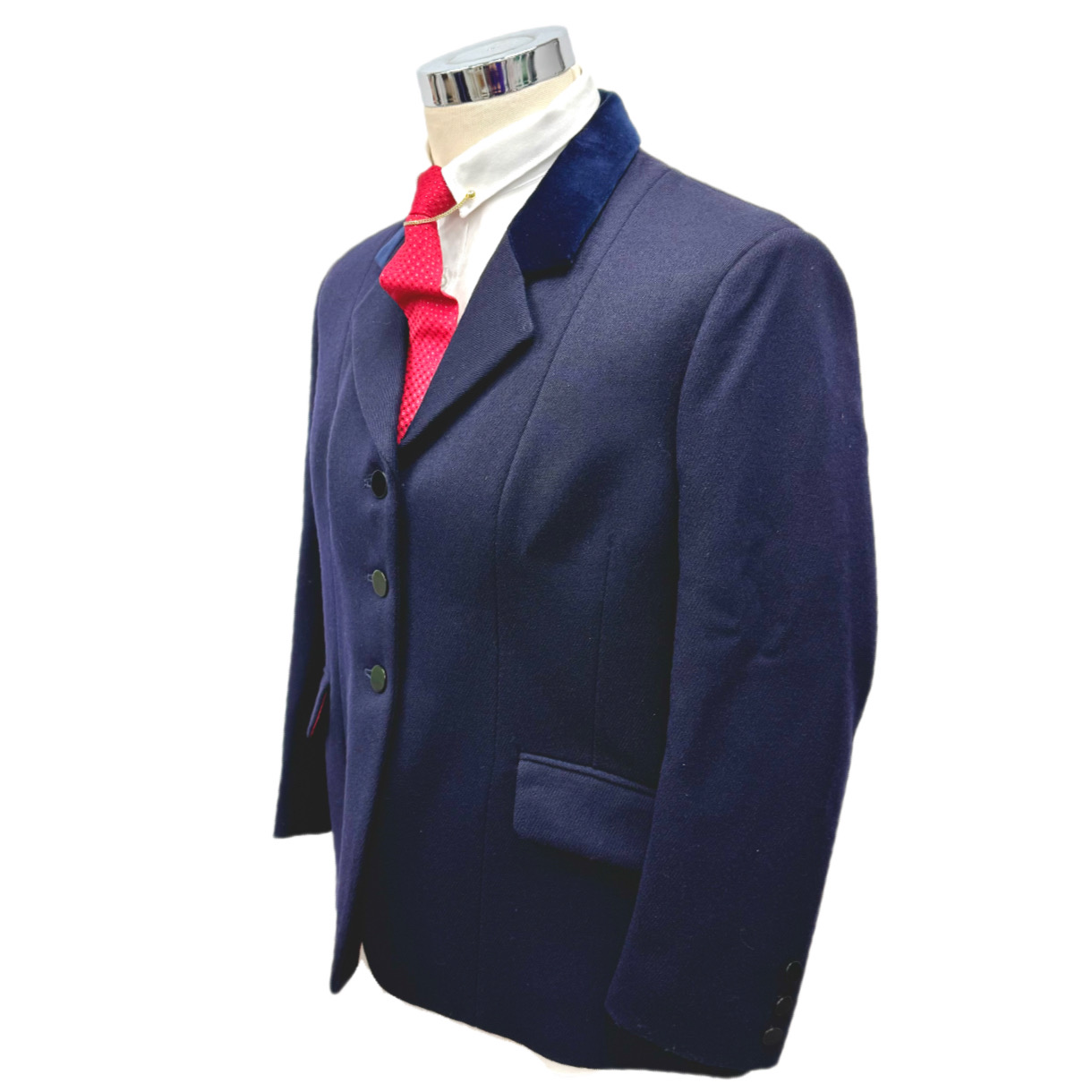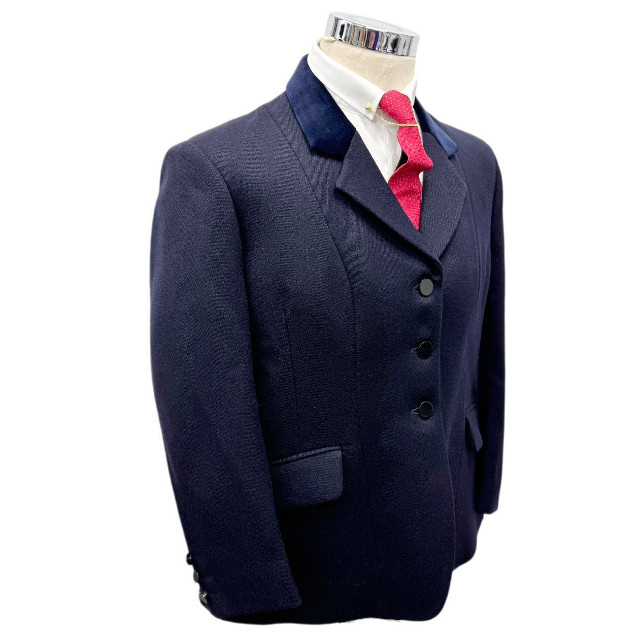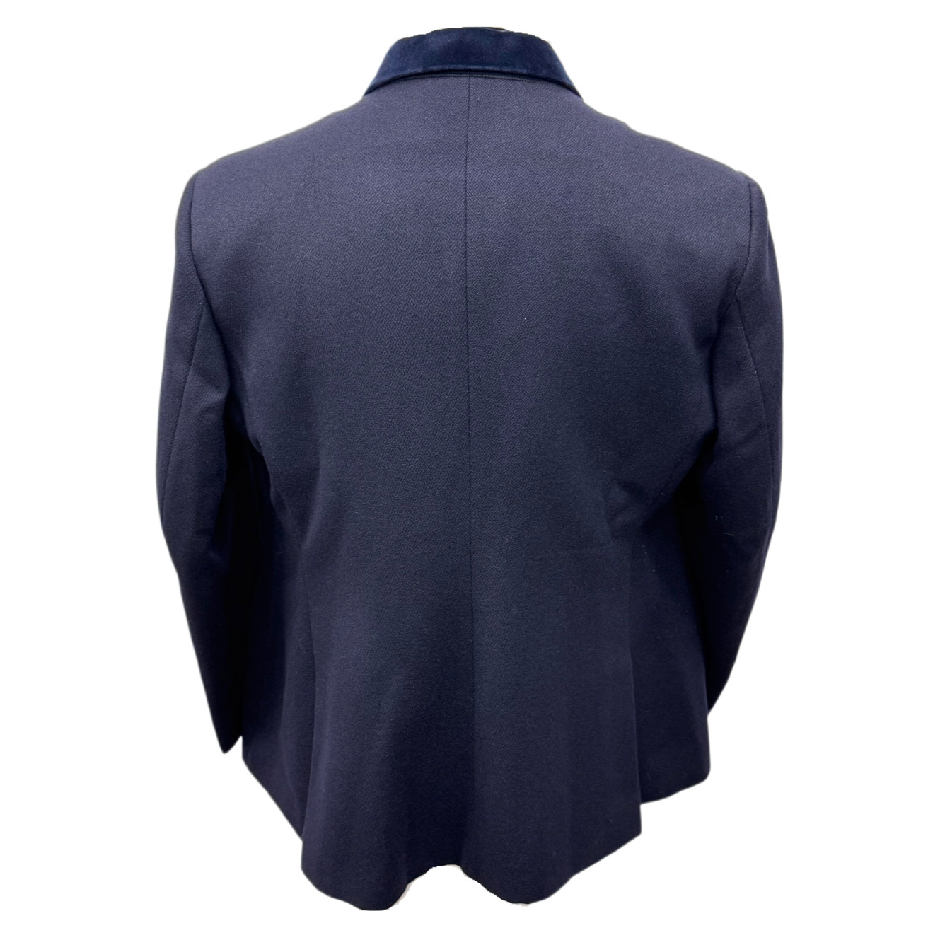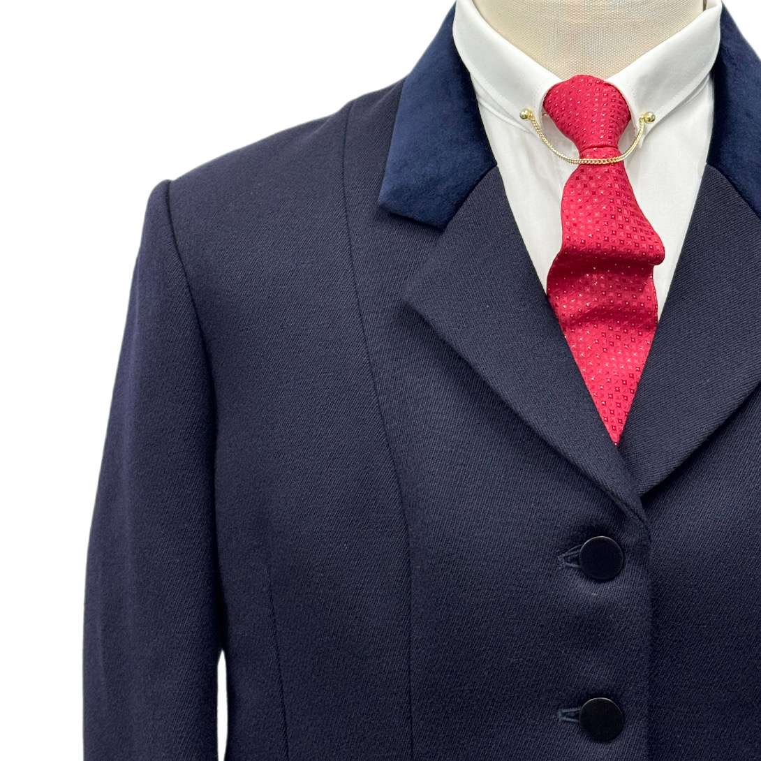 Showing Selection navy blue show jacket, with navy velvet collar, pocket jettings and plain black buttons.